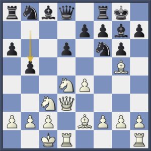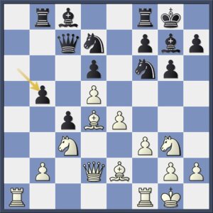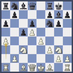 Maakt op brute wijze een einde aan het zwarte initiatief op de damevleugel. Eerder was deze pionzet minder omdat de lange diagonaal dan te zwak werd, maar met de loper op d4 is het geen probleem.