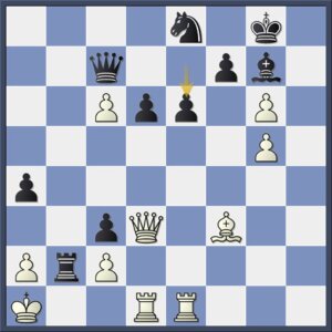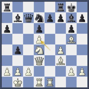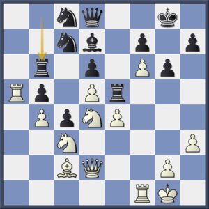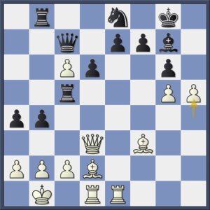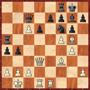 Een goede verdediging was hier nog 25…Pc6!. Zwart geeft de pion op f7, waarmee de witte aanval wel stopt, voor die op d4, met gelijke kansen. Ook nu was 26.g4! het krachtigst geweest, maar wit pakt eerst nog een open invalslijn.