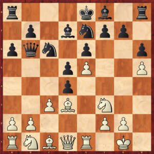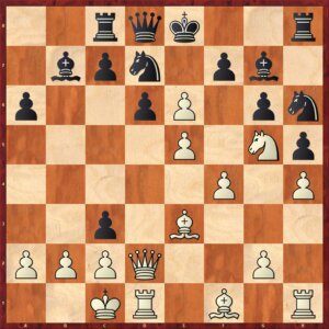 De thematische opstoot. Na 16…dxc4 slaat wit met de loper terug en probeert hij zijn d2-paard naar d6 te krijgen.
