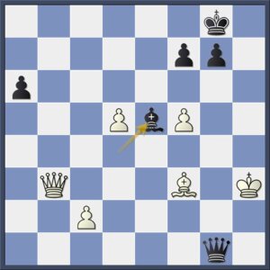 De pion op h5 is niet belangrijk. Wit wil nu op c4 laten ruilen om de loper op dat veld te krijgen, met aanval op e6 en a6. Het wordt de zwarte koning te heet onder de voeten, maar het is al te laat: