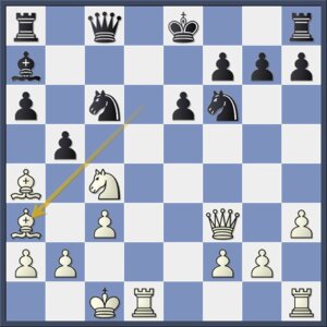 Bevrijdt zijn paard, en dus ook zijn koningstoren. Daarmee zet wit een min of meer gespiegelde versie op van de aanval in de partij Pool-Ochtman.