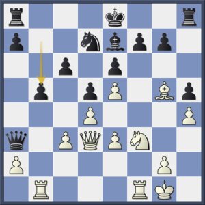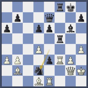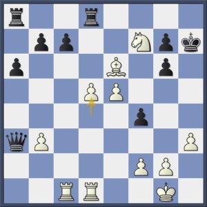 Dat is een spectaculaire zet die nog wel wat uitleg vergt. De witte dreiging lijkt Tc1-c4xf4-h4+ te zijn, maar zwart heeft natuurlijk ook nog zetten. Maar welke?? Na 27…Tf8 (27…c6 28.d6), wat de genoemde manoeuvre verhindert, blijkt wits echte pointe: 28.Pg5+ Kh6 29.h4 en nu blijkt de d-pion wits voornaamste troef te zijn. De pion stoomt door, al dan niet voorafgegaan door Txc7, en de witte loper en paard, om niet te spreken van de torens, zijn ijzersterke ondersteuners.
