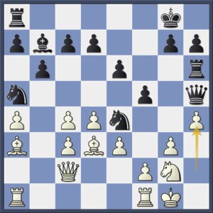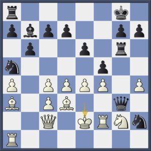 Maar nu komt het als pionoffer, met extra kracht. Door de configuratie van zwarts stukken, zonder ondersteuning van de dame, komt Ohler niet meer tot rokeren.